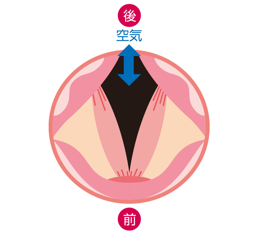 気道の2つのフタ、軟口蓋と咽頭蓋は開いた状態です。声帯は左右2枚の筋肉のヒダによって閉じており、空気が声帯にぶつかり振動することによって音がでます。