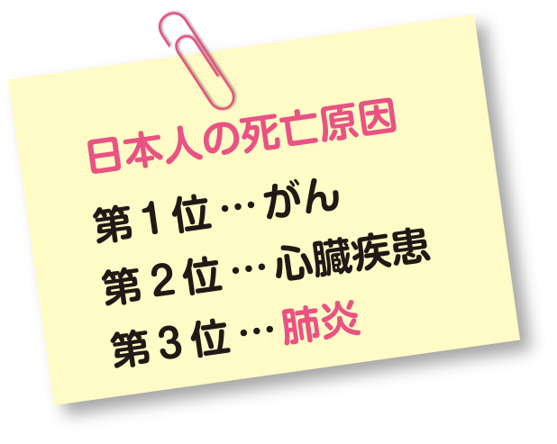 長年、第3位だった脳血管性疾患(おもに脳卒中)を、2011年に死亡数で上回り、それ以降、肺炎が第3位に。この原因は、飲み込む力が衰えて、誤嚥性肺炎で亡くなる高齢者が増えたことにあります。